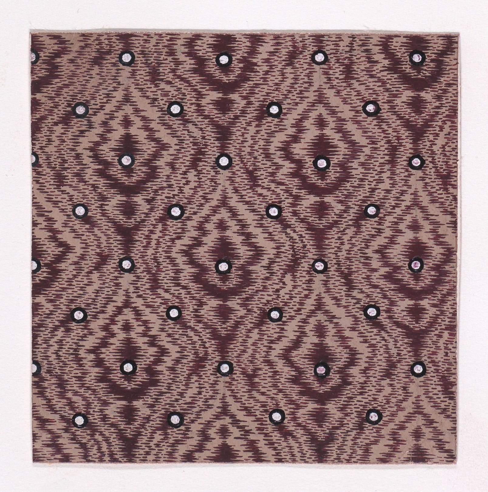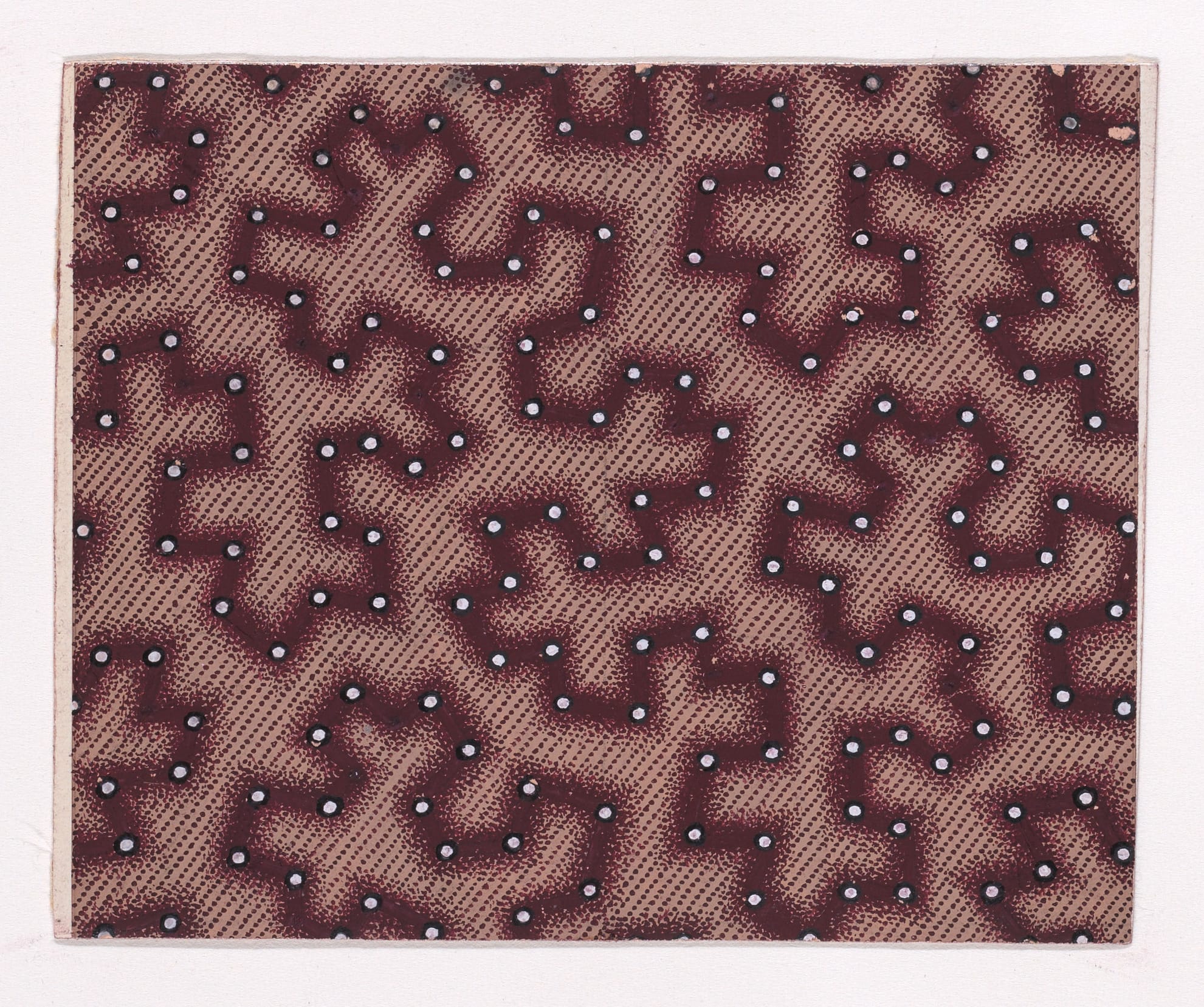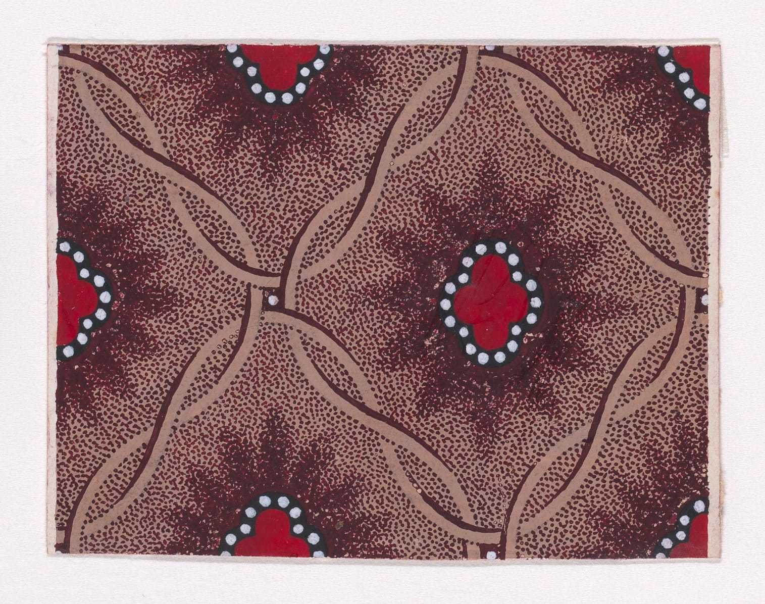 Anonymous textile prototypes, Mulhouse, Alsace, c.1840. Rectilinear design sheets generated within the industrial print studios of the Haut-Rhin. Each document encodes surface strategies for mass deployment—pearl rows, abstract chromatic fields, simulated resist-dye grounds. Executed as precision studies for repeat application, they reflect Mulhouse’s role as a nineteenth-century vector hub of textile innovation and print chemistry.