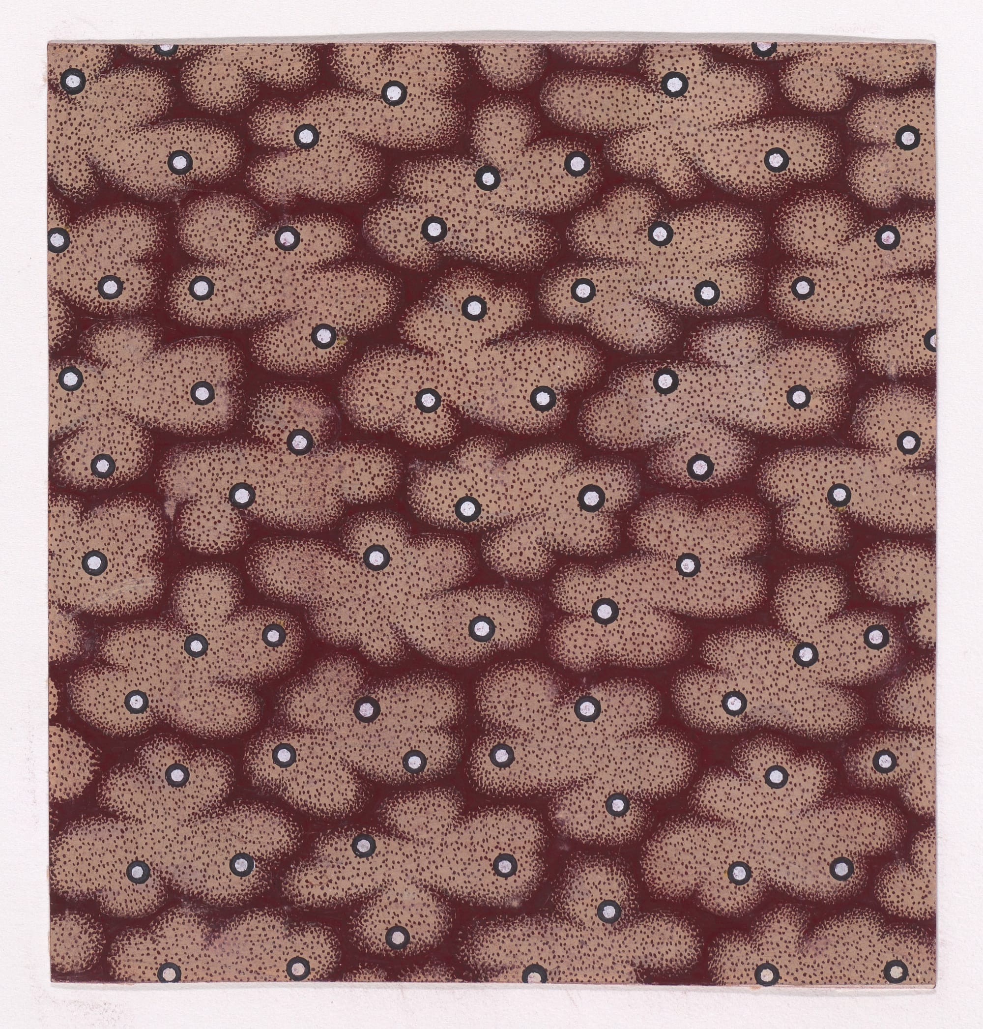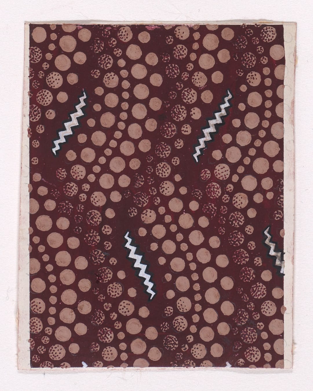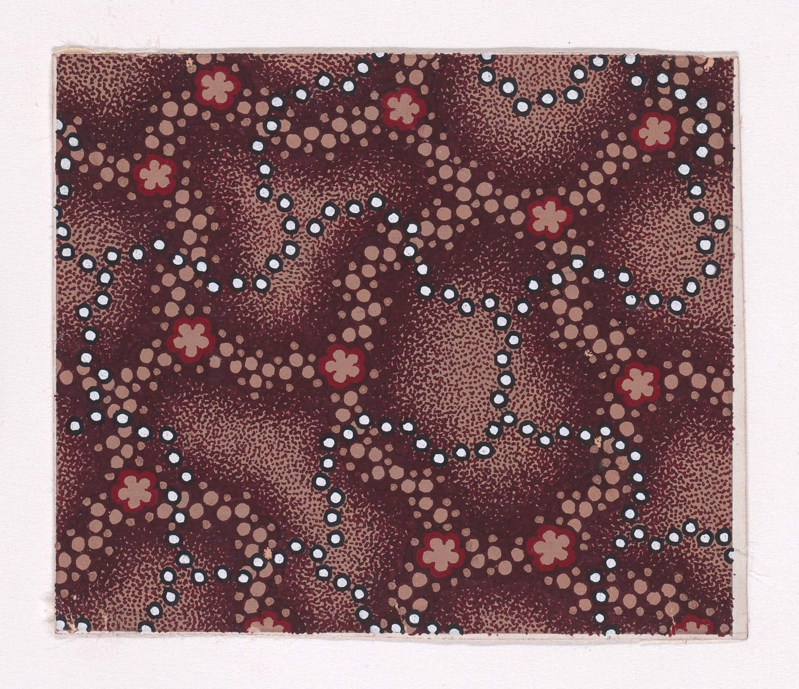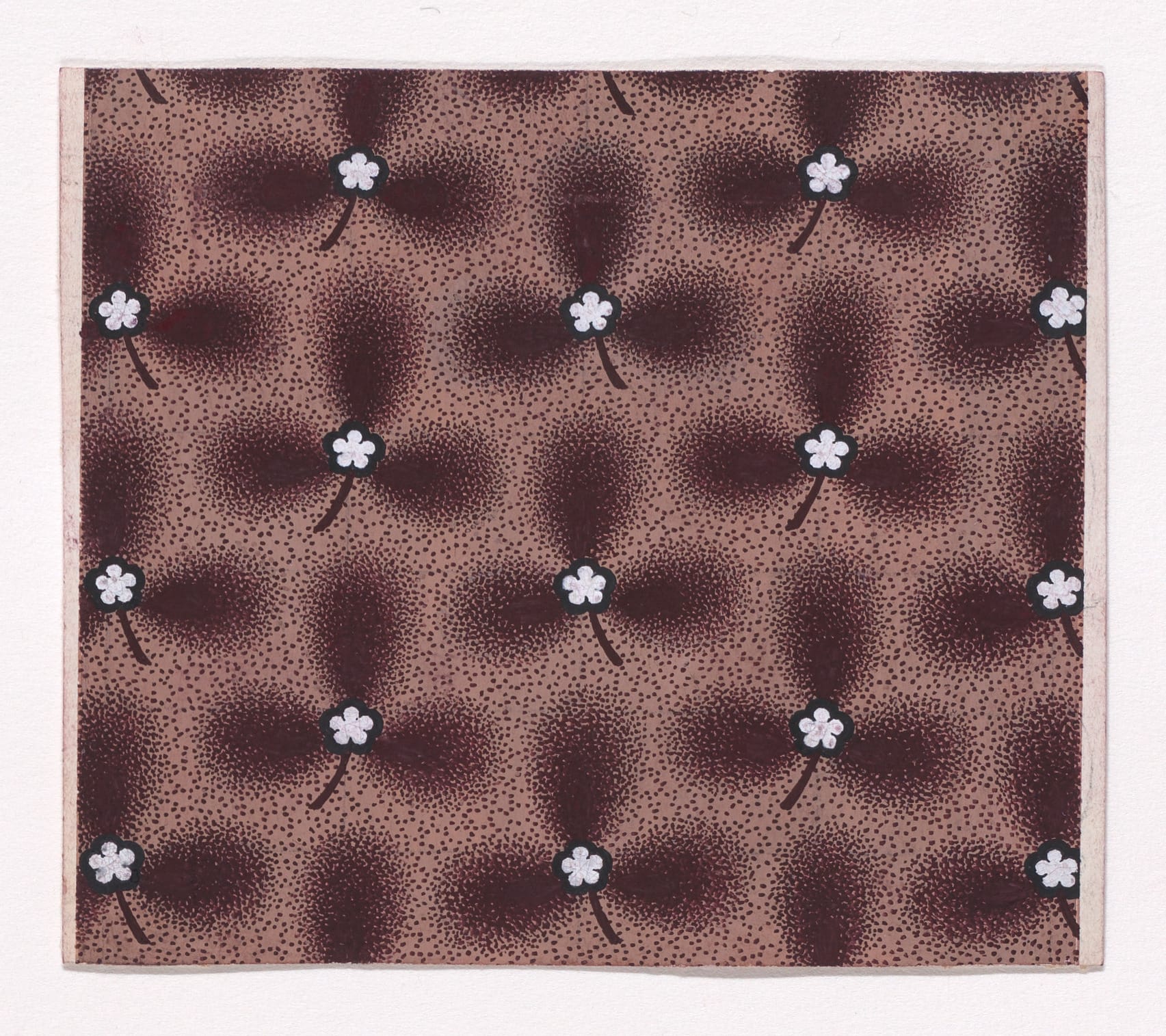 Anonymous textile prototypes, Mulhouse, Alsace, c.1840. Rectilinear design sheets generated within the industrial print studios of the Haut-Rhin. Each document encodes surface strategies for mass deployment—pearl rows, abstract chromatic fields, simulated resist-dye grounds. Executed as precision studies for repeat application, they reflect Mulhouse’s role as a nineteenth-century vector hub of textile innovation and print chemistry.