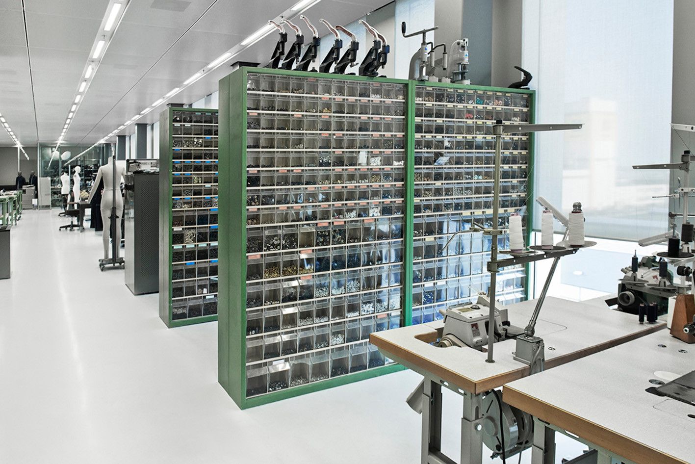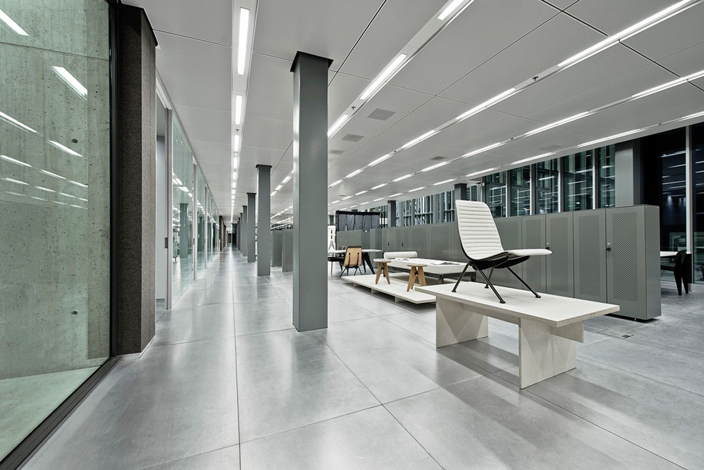 The horizontal building spans 27,500 square meters and stretches 140 meters in length. It comprises a central creative hub that houses G-Star RAW's essential departments. This creative center is encircled by offices, parking spaces, and supporting amenities. The differentiation between the functional support areas and the dynamic creative core is emphasized by the use of distinct materials. The outer ring is constructed from black concrete, giving it a solid and unified appearance, while the transparent glass facade reveals the vibrant creative core within. The lower section of the ring serves as a base for parking and drop-off purposes, as well as a platform for installations and events.