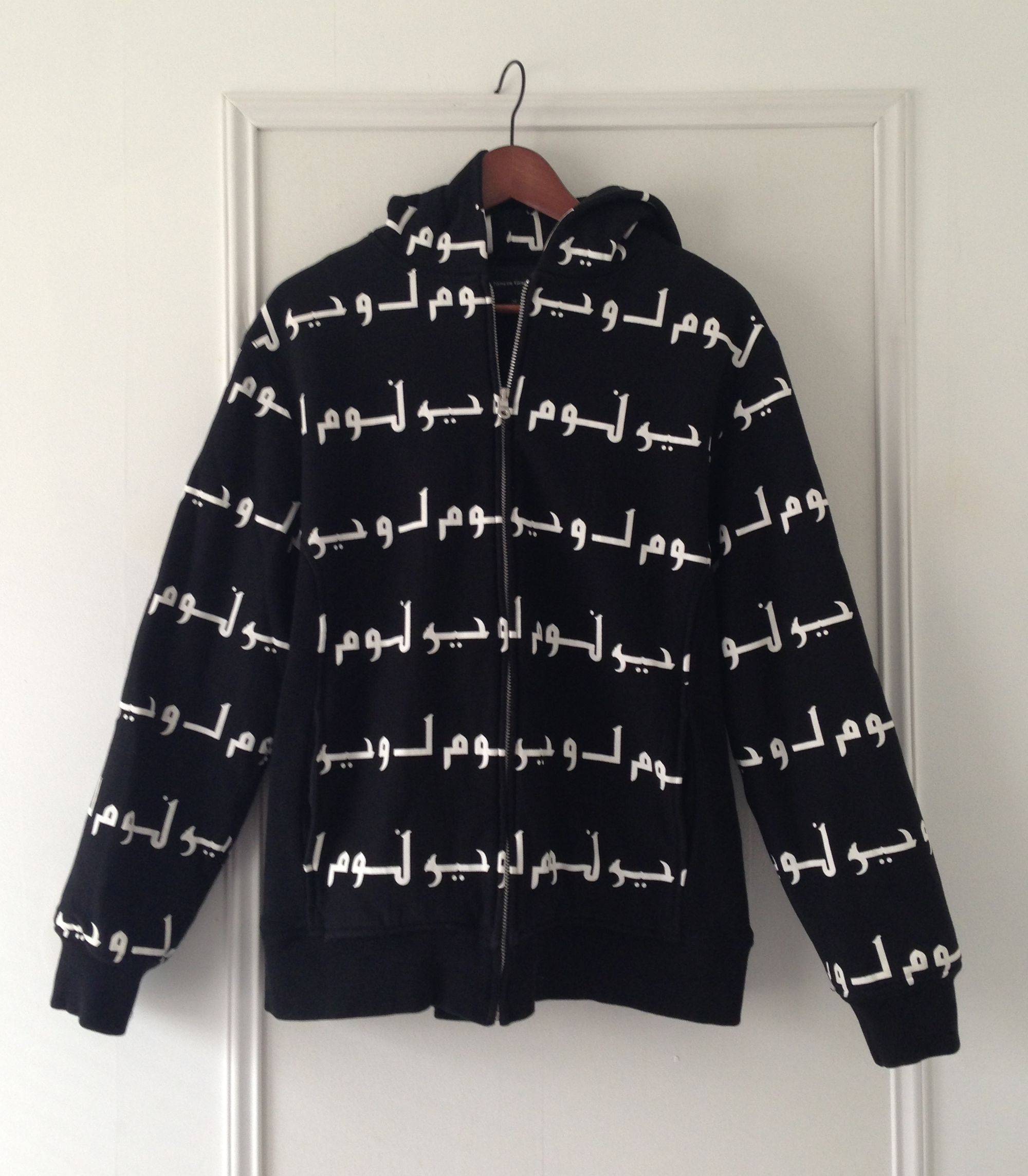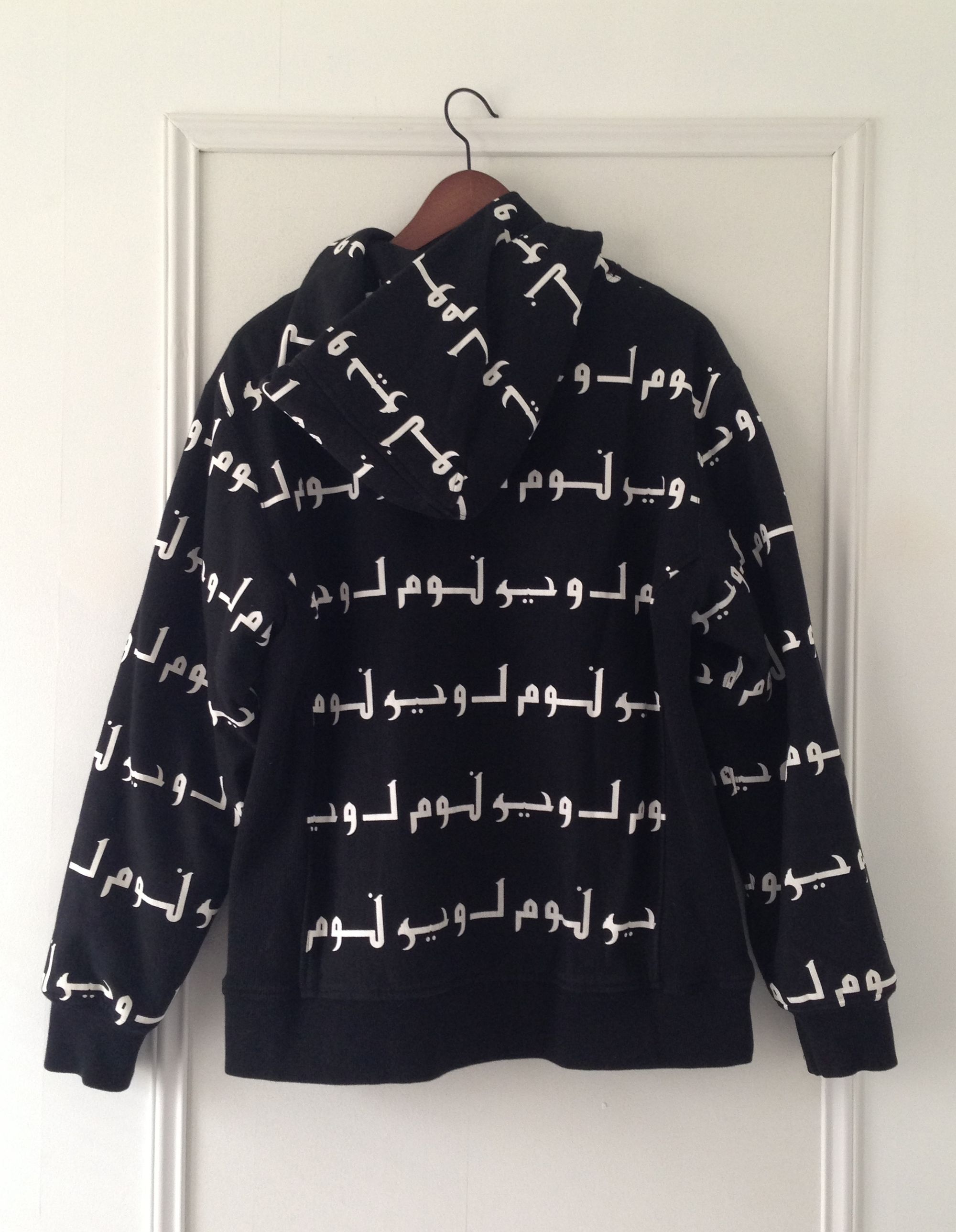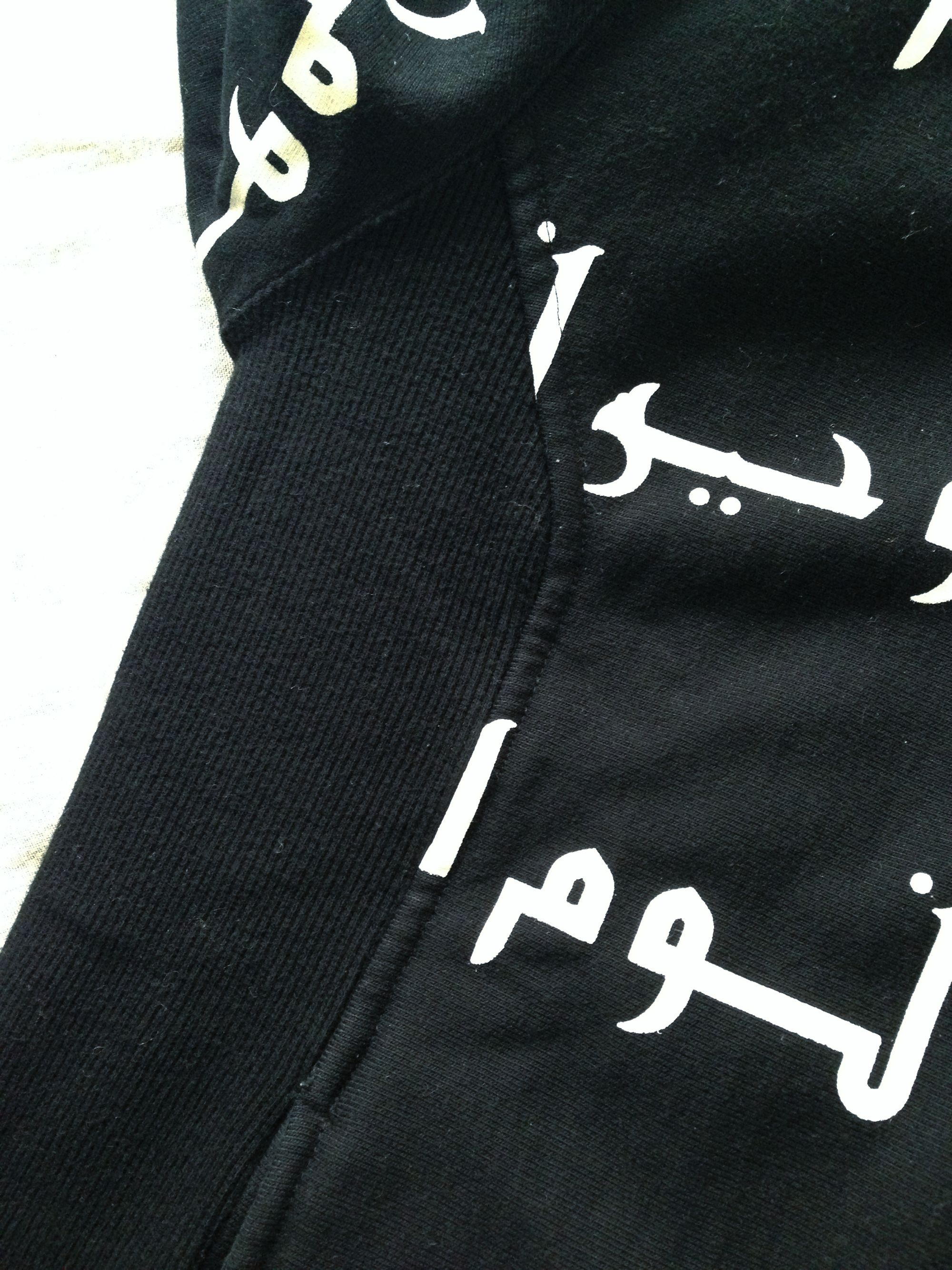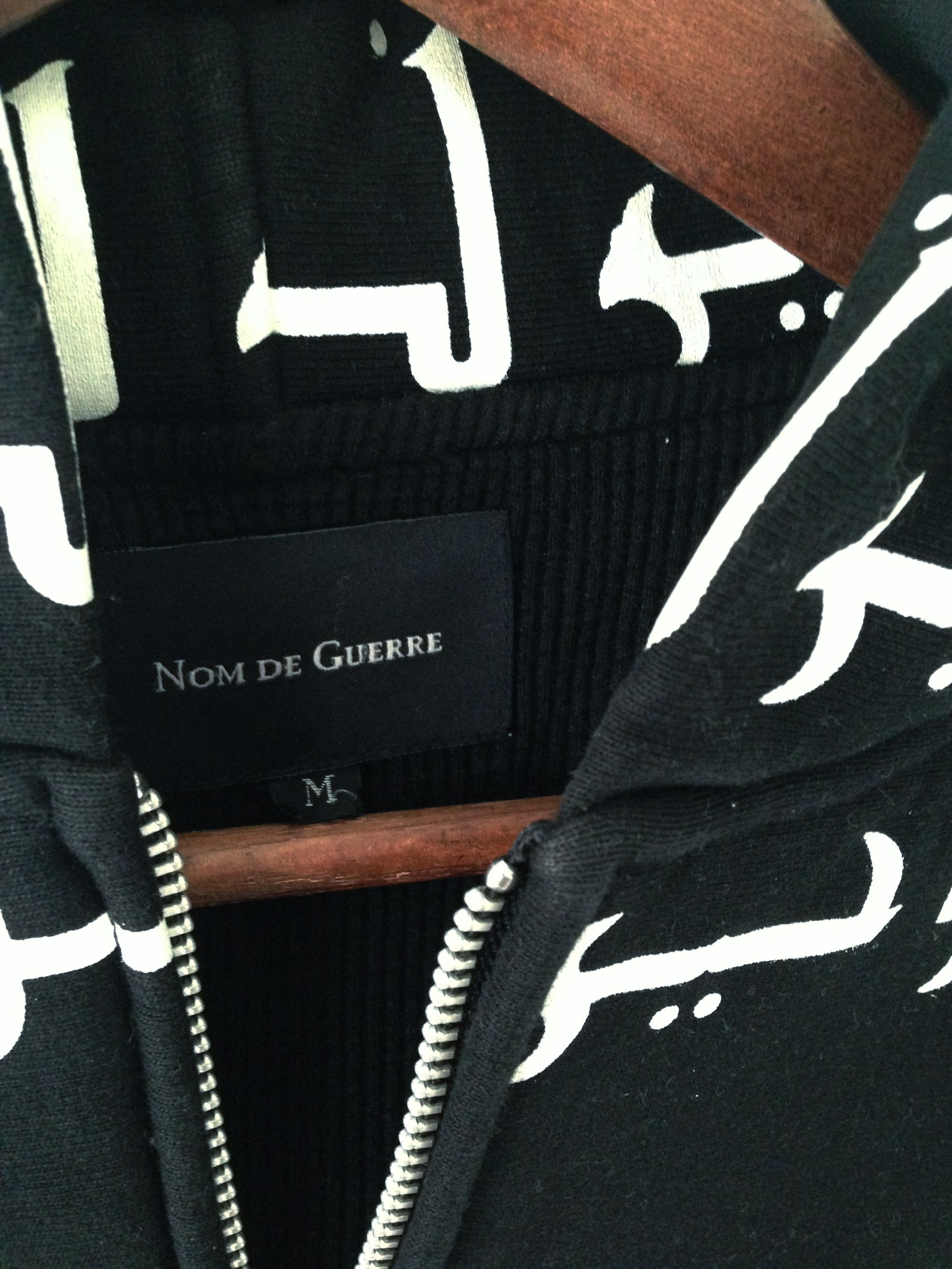Nom de Guerre "Arabic" Hooded Sweatshirt Nom de Guerre’s most controversial piece was their “Arabic” all-over print, which hit right at the height of Islamophobia post 9/11.