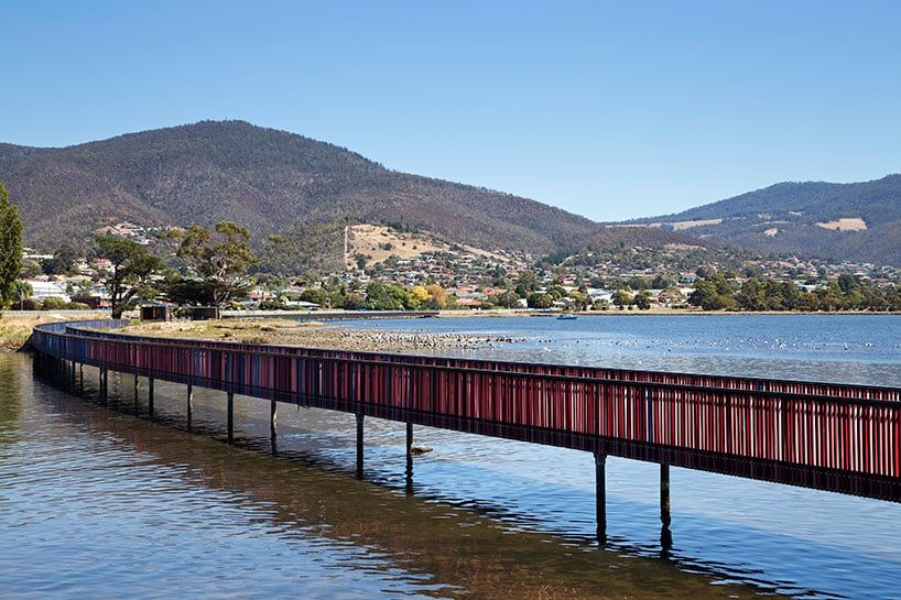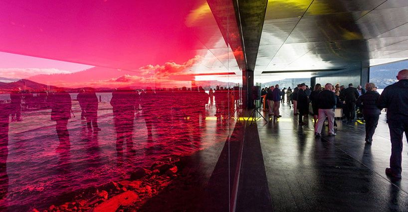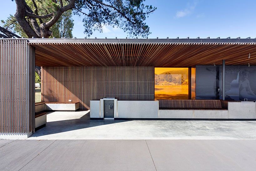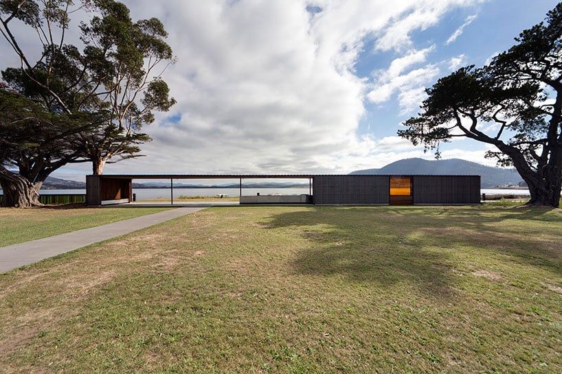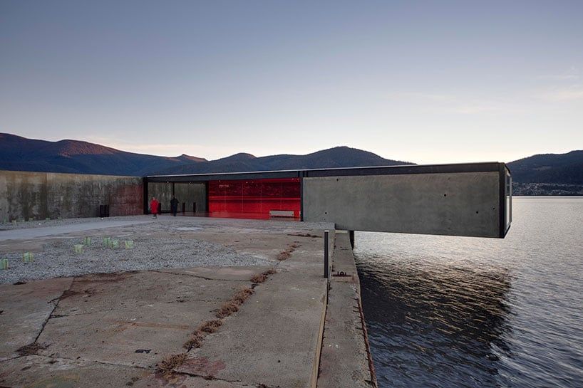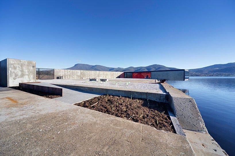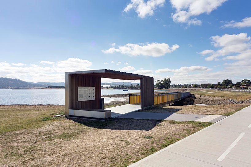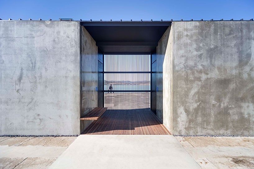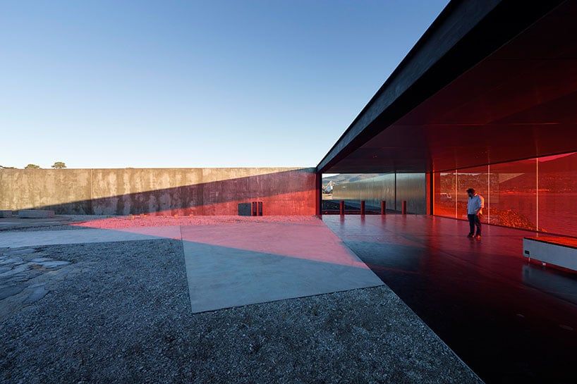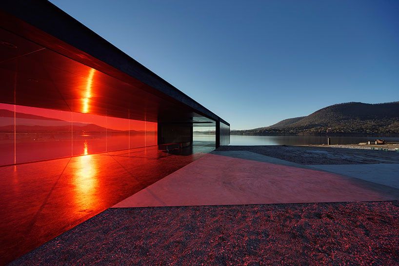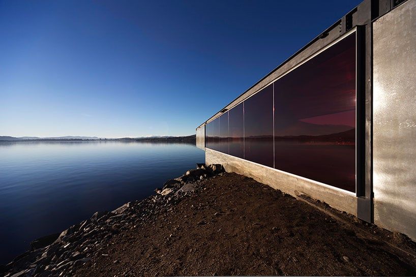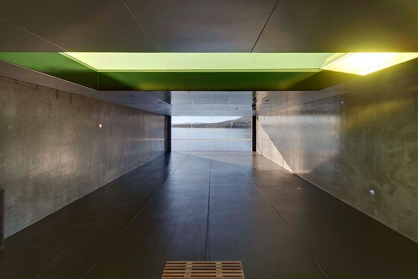 the grove pavilion is located at the center of the arced walkway where it briefly touches upon land, between the constantly texture of the water and matured trees. barbeques and public space provide recreational services to visitors within a subdued black structure that frames the colorful surrounding landscape. continuing eastward down the walkway leads to the wilkinson’s point pavilion born from an existing concrete pad built in the mid 20th century as the foundation for an unrealized bridge. the pavilion, a series of intersecting planes exhibiting various degrees of transparency and filtering of views and colors, cantilevers out over the water framing the site and a large open-air pad capable of hosting large scale events. massive concrete walls support a floating canopy containing an expansive red glass wall and a yellow skylight towards the cantilevered portion. the architecture adopts a simple form, poetic and restrained in the landscape, an experience heightened by its relative isolation from any other man-made developments.