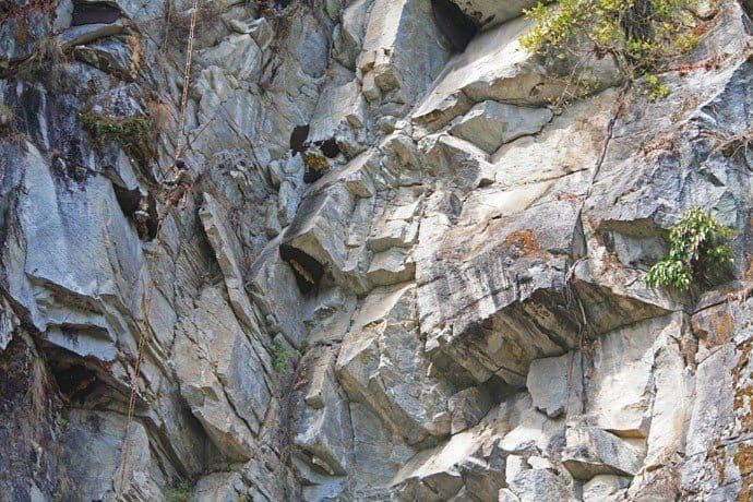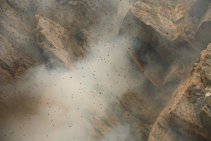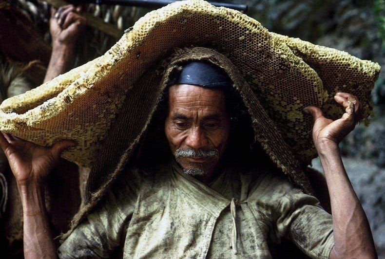 Nepal is home to the Apis Laboriosa, the biggest honey bee on the planet, and honey hunting plays a significant role in the local way of life. The bees build their hives on the cliffs of the country's foothills, which adds complexity to the honey hunting process. Local honey hunters use rope ladders and baskets to access the combs after driving the bees away with smoke from a fire underneath the hives. They carefully collect the honey treasure from the combs while dealing with territorial bees. The harvesting occurs once a year and begins with a harvest ritual that varies across towns, often starting with a prayer and the offering of flowers, rice, and fruits.