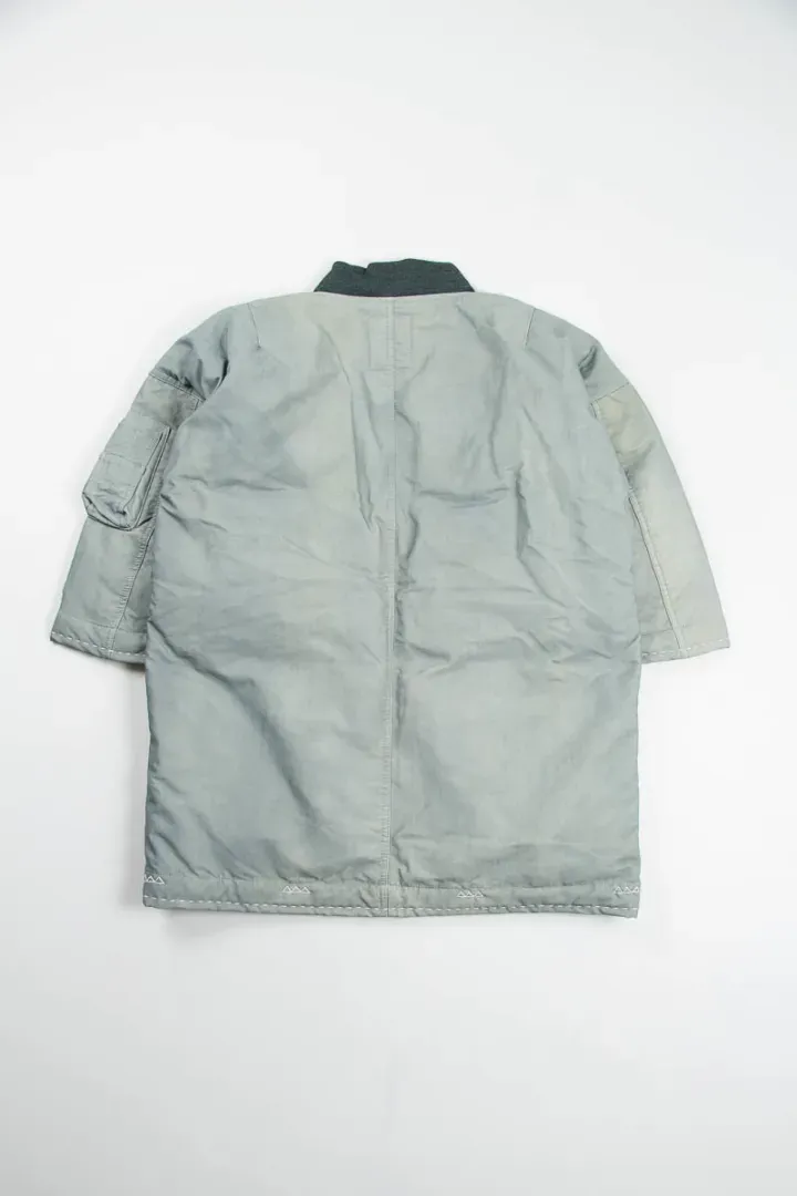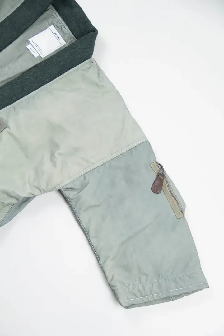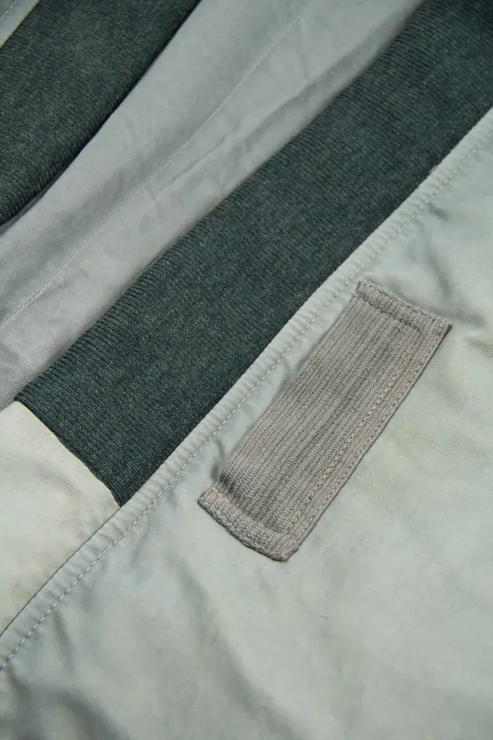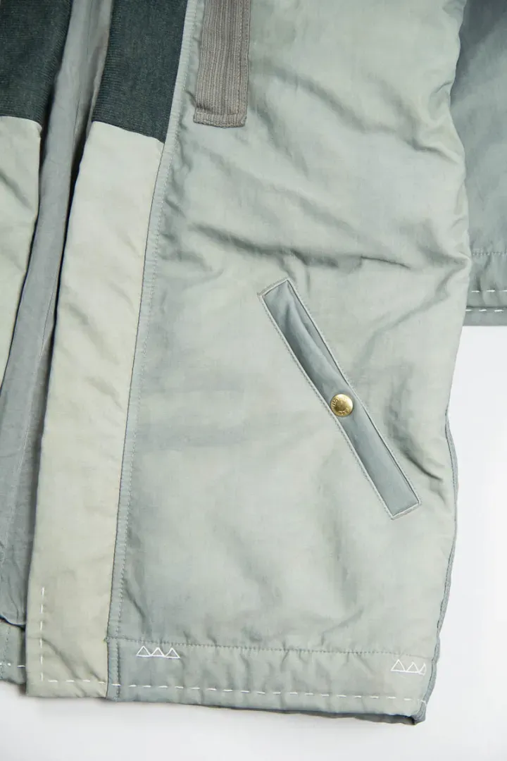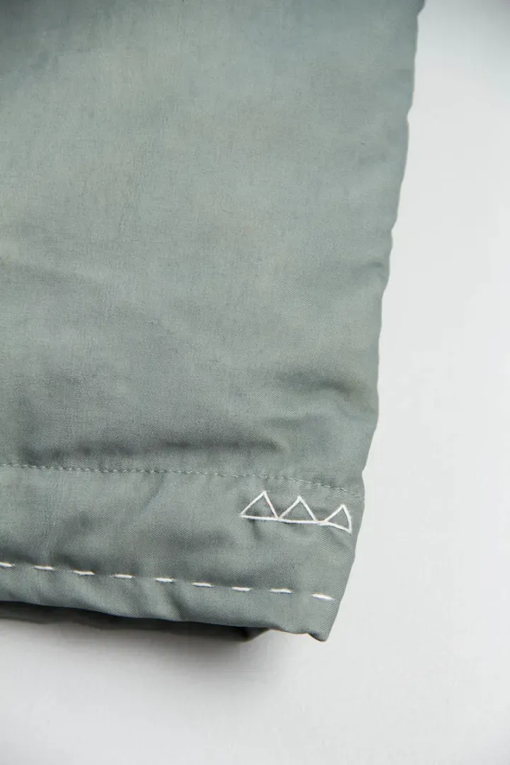 Naturally dyed Italian nylon with a white goose down fill, ribbed collar, 2 slanted snap button pockets, Talon zippered utility pocket on one sleeve, patch detailing on the placket and hand–stitched sashiko.